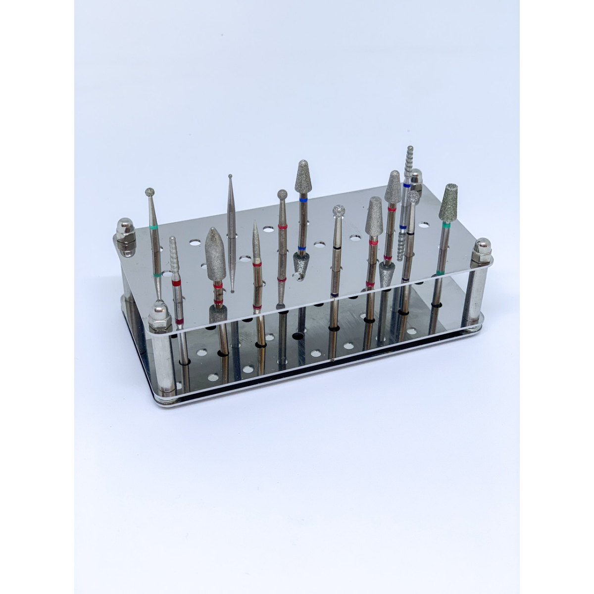 Формат виробу, є універсальним у використанні, так як даний метал дозволяє як зберігати на робочому місці насадки, так і проводити стерилізацію підставки разом з фрезами, не витягуючи їх з посадкових місць в абсолютно будь - яких стерилізаційних апаратах (паровий, повітряний, плазмовий, ультрафіолетовий або ультразвукові стерилізатори).