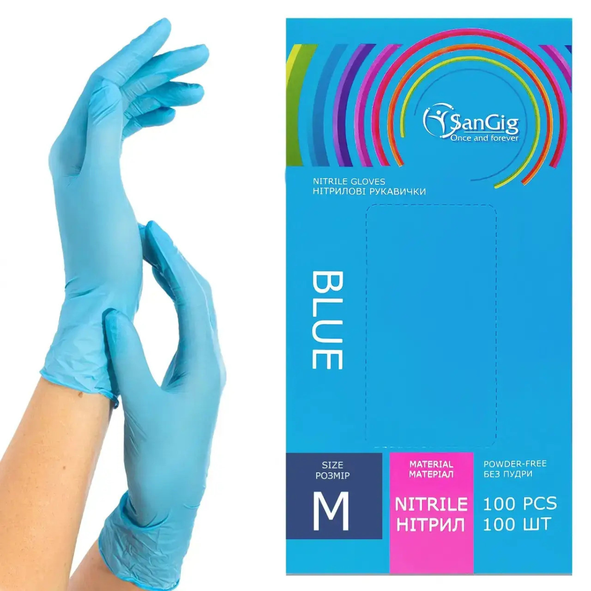 • Рукавички нітрилові SanGig, щільність 3.5 г. - блакитні (100 шт) M