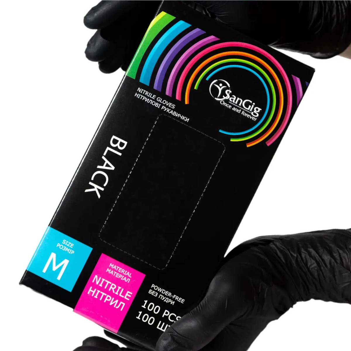 • Рукавички нітрилові розмір M SanGig, щільність 3.5 г. - Чорні (100 шт)