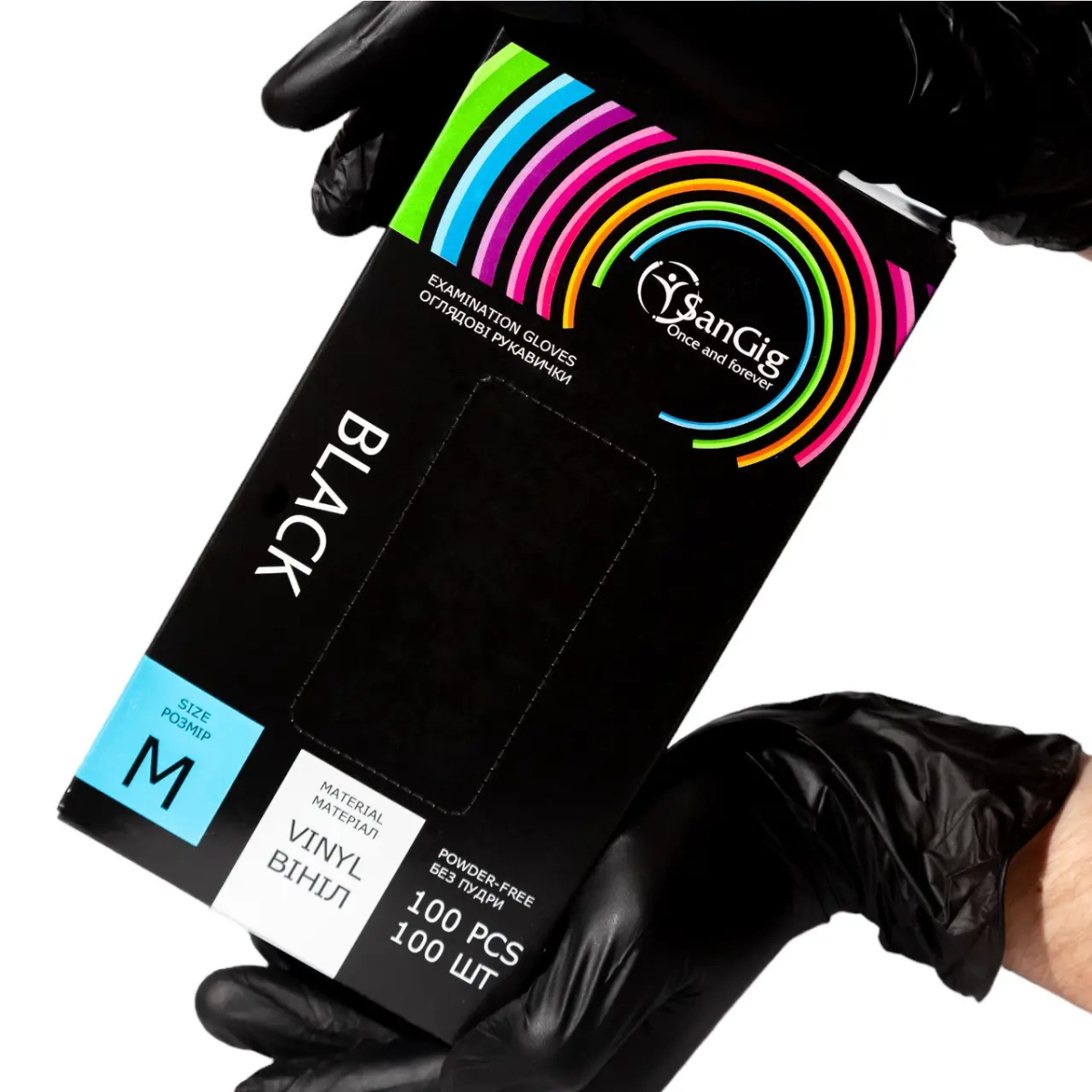 Рукавички оглядові Sangig вінілові нестерильні Розмір M 100 шт Чорні