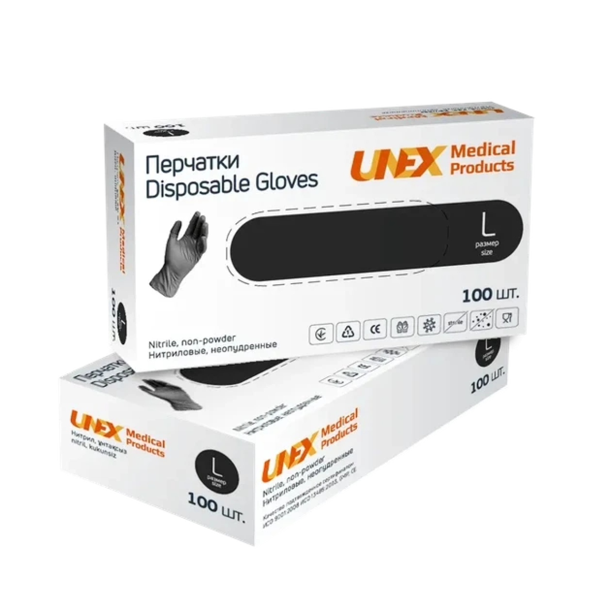 Чорні рукавички нітрилові Unex Medical Products виготовлені з суміші бутадієну та акрилонітрилу (синтетичний нітрил). В процесі полімеризації даної суміші утворюється щільна, еластична, високоміцна плівка, з якої виготовляються рукавички. Нітрилові рукавички гіпоалергенні, тому використовуються як альтернативний варіант, у разі алергії на натуральний латекс. Забезпечують високу чутливість рук, до того ж володіють відмінним опором до проколів і порізів. Внутрішня поверхня виробів, для їх більш легкого одягання, має поліуретанове покриття, що перешкоджає запотіванню долонь, забезпечуючи комфортне використання рукавичок протягом тривалого часу.